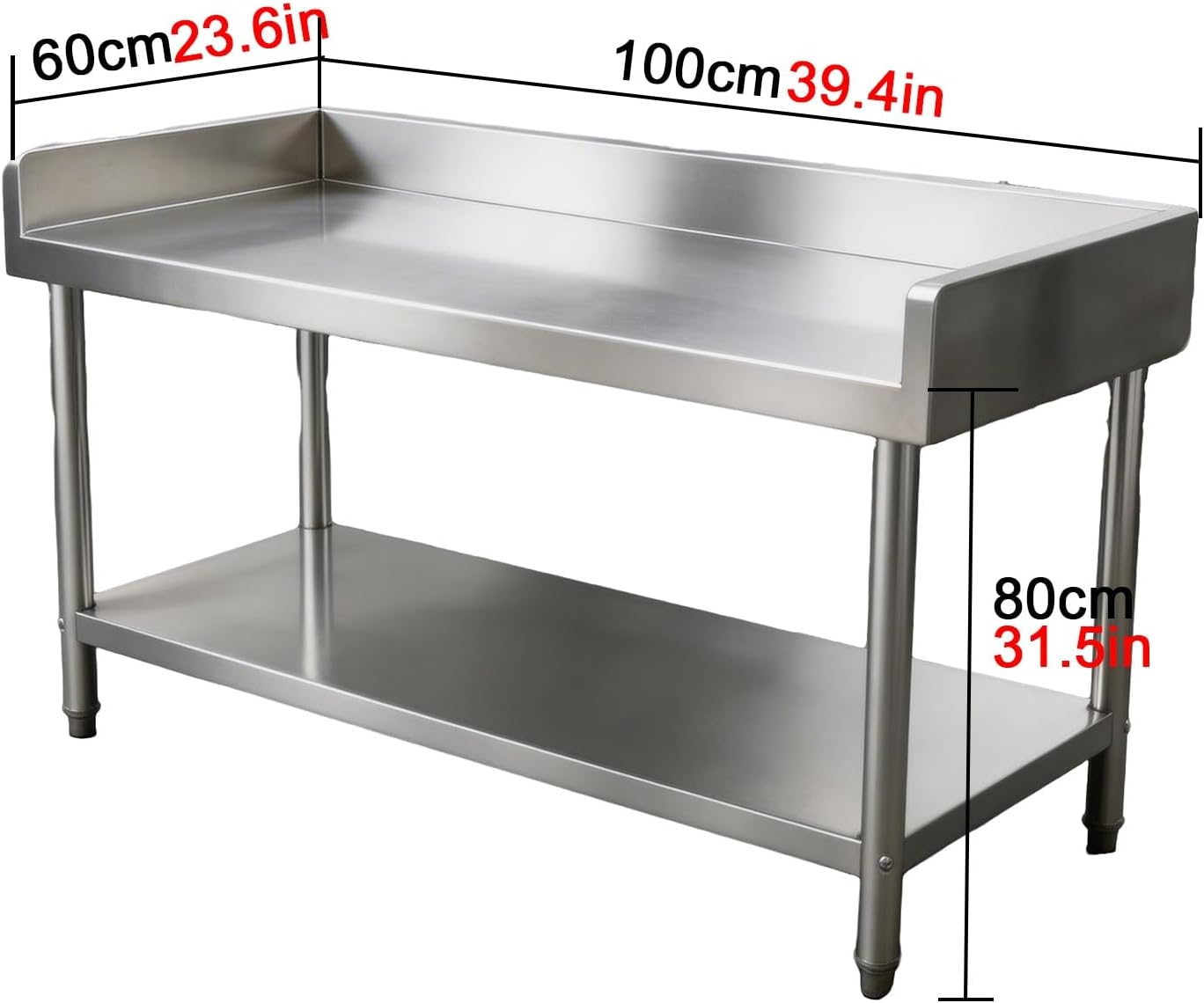 Stainless Steel WorkbenchConstructed from thickened material with adjustable legs and splash guards on three sidesTriangular reinforced structure with screw fastenings, supporting up to 1000kgProduct Specifications:Product Name: Stainless Steel WorkbenchMaterial: Stainless SteelColor: SilverAssembly Required: YesDimensions:L80xW50xH80cm (31.5x19.7x31.5in)L80xW60xH80cm (31.8x23.6x31.5in)L100xW50xH80cm (39.4x19.7x31.5in)L100xW60xH80cm (39.4x23.6x31.5in)L120xW60xH80cm (47.2x23.6x31.5in)Product Contents: Stainless Steel Workbench*1 + Installation HardwareImportant Notes1. Product dimensions may vary slightly due to measurement tool differences.2. Photographic techniques and lighting conditions may cause color differences.3. Stainless steel welding processes may result in minor scratches or weld marks, which do not affect normal product use.