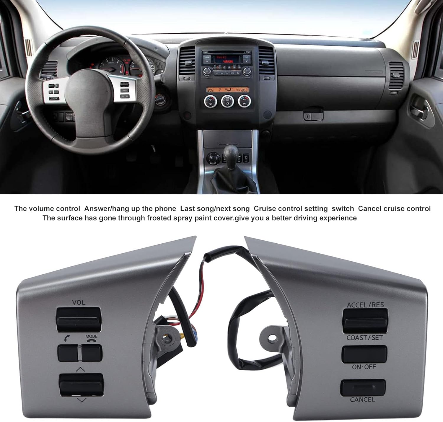 [ Design] Molded based on original car data to ensure a good Fit for and maintain the original car model. [Easy Installation] Simple and convenient installation that does not damage any parts of the original car, direct replacement for. [sturdy Material] Made of abs, to high and low temperatures, preventing aging for long-lasting use. [Enhanced Visibility] Frosted spray paint cover for good adhesion, anti fade, providing clear visibility for better driving experience. [Compatibility] replacement for steering wheel switch for frontier pathfinder 2005-2015, xterra 2005-2012. Spec: Item Type: Steering Wheel Control Button Material: ABS Fitment: replacement for D40 2005-2015 replacement for Frontier 2005-2012 replacement for Xterra 2005-2012 replacement for Pathfinder 2005-2012 Package List: 1 x Steering Wheel Control Button How To Use: Direct replace installation.